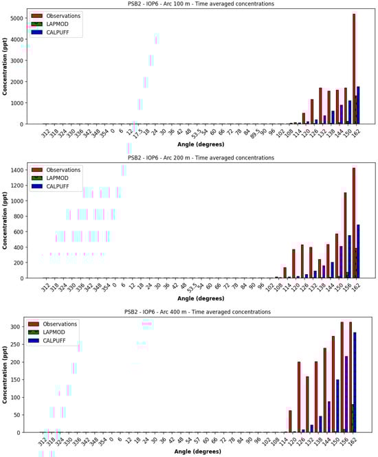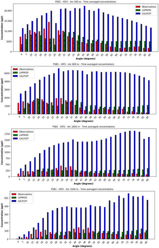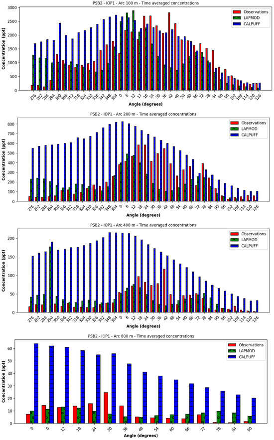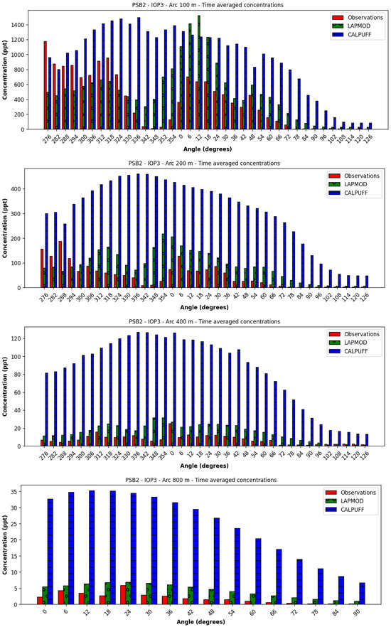 The time-averaged concentrations over the arcs are illustrated in Figure 28. The LAPMOD model underpredicts the observed concentrations, while the CALPUFF predictions are closer to the observations, even though the peaks are not correctly predicted. The CALPUFF ranks are over 3/5, while the LAPMOD ranks are smaller than 2/5.