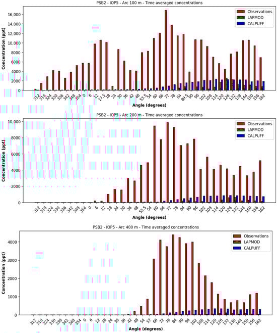 In general, the agreement of the predictions of the two models with the observations is satisfactory, but for the four October 2016 IOPs of PSB2. The term “satisfactory” is used because, for the IOPs in which the wind blows effectively towards the sampling sites and for the time-averaged concentrations, some of the performance evaluation criteria proposed in [31] to define a “good” model are reached. For example, [31] requires that the following three rules be observed: