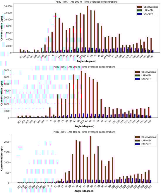 The statistical parameters calculated for PSB2-IOP7 are summarized in Table 17. The global analysis with time-paired data (N = 1472) shows—as for IOP6—that the observations of this IOP are not well reproduced by the models, particularly by LAPMOD. The ranks are 1.3/5 and 2.5/5, respectively, for LAPMOD and CALPUFF.