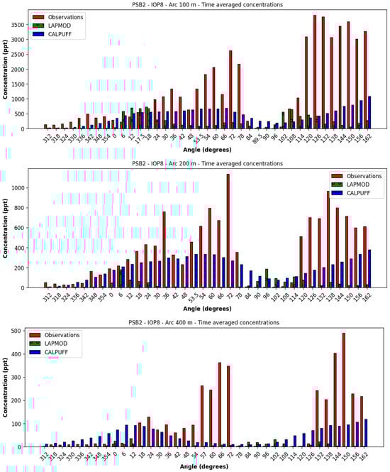 The two dispersion models fail in reproducing the observations during the four IOPs of PSB2 conducted during very stable conditions in October 2016 (IOP5–8). This failure may be due to the inability of the CALMET meteorological model to create the observed wind direction variation in the few meters above the ground. Indeed, the first vertical level of CALMET has a height of 20 m, within which the wind direction is constant for each horizontal cell. Of course, other reasons for the failure may be related to wrong or non-appropriate physics within the dispersion models when simulating stable low wind situations, which might have larger horizontal wind variations, as described by [16]. As pointed out by [17] analyzing the PSB2 results, the data indicate that the large increase in concentration variability is linked with the suppression of turbulent mixing, small eddy length scales, and meandering in very stable conditions.