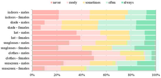 Regarding protection methods, both females and males most commonly use sunscreen and seek shade, while protective clothing is the least used for both groups (Figure 1). The strongest association was found for the use of sunscreen. Females use sunscreen (χ2 = 86.193, p < 0.0001, Cramer’s V = 0.266), as well as wear protective glasses (χ2 = 24.447, p < 0.0001, Cramer’s V = 0.141) significantly more than males. More than half of females (56.14%) often and always use sunscreen, compared to 32.58% of males, while 25.31% of males do not use sunscreen.