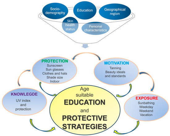 - Falk, M.; Anderson, C.D. Influence of age, gender, educational level and self-estimation of skin type on sun exposure habits and readiness to increase sun protection. Cancer Epidemiol. 2013, 37, 127–132. [Google Scholar] [CrossRef]