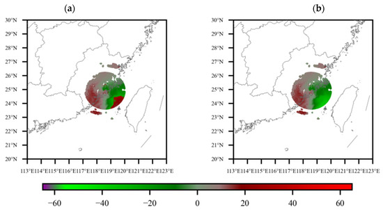 The comparison between the quality-controlled and raw Vr data at the 1.5° elevation angle is shown in Figure 1. It is evident that the quality-controlled data significantly reduces clutter interference, resulting in a clearer and more coherent wind field structure, which reflects the typical radial wind features of a tropical cyclone system. This provides higher-quality input data for subsequent data assimilation and model initialization. The quality control method has been widely applied in the study of tropical cyclones and other convective systems and has been proven to be stable and effective in several cases [33,34,35].
