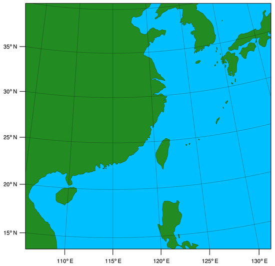 In this research, simulations were conducted using the Advanced Research WRF (ARW) model, version 4.1, coupled with the WRF-3DVAR assimilation system [36]. The boundary and initial conditions were provided by the Final Analysis (FNL) product of the Global Data Assimilation System (GDAS) [37], initialized at a resolution of 0.25° × 0.25°. Figure 2 outlines the study area near 119.353° E and 26.724° N. A single domain setup without nesting was employed, comprising 601 × 601 horizontal grid points at 5 km spacing. The vertical structure consisted of 41 levels, with the model top defined at 10 hPa.