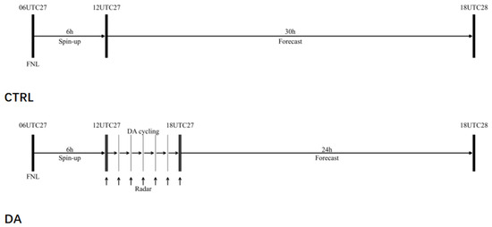 The control experiment (CTRL) began at 0600 UTC on 27 July 2023 and ran through 1800 UTC on 28 July, covering a total simulation time of 36 h. Both assimilation experiments were launched at the same starting point, after a 6-h spin-up, to prepare the background field. Ground-based radar radial velocity data were assimilated hourly between 1200 and 1800 UTC on 27 July using the WRF-3DVAR system. The predictive results examined in this work cover the 24-h window starting at 1800 UTC on 27 July and ending at the same time on 28 July.