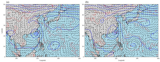 Figure 4 illustrates circulation features at the mid-tropospheric level (500 hPa) for 1200 and 1800 UTC on 27 July 2023. At 1200 UTC, Typhoon Doksuri was located over the northern sector of the South China Sea, moving in a northwesterly direction influenced by a southeasterly flow stemming from the southwestern flank of the subtropical ridge.