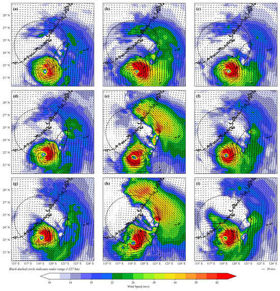 A 700 hPa wind speed (shaded, units: m s⁻1) and wind vectors (arrows; reference vector: 20 m s⁻1) from the (a–c) 1200 UTC, (d–f) 1500 UTC, and (g–i) 1800 UTC analyses on 27 July 2023. Panels (a,d,g), (b,e,h), and (c,f,i) represent the CTRL, 3DVAR_a, and 3DVAR_b experiments, respectively. These plots depict the evolution of Typhoon Doksuri’s wind structure at 700 hPa under different data assimilation configurations. The dashed circles indicate the radar observation coverage areas.