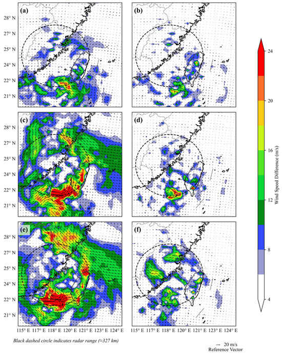 The wind speed difference fields (Figure 6) indicate that the spatial distribution of enhancements varies by experiment and time. Broader and more intense enhancement regions in multiple quadrants are shown by 3DVAR_b, especially to the north and southeast. In comparison, 3DVAR_a exhibits concentrated increases primarily on the northern and western flanks. These differences may be related to the varying sensitivity of assimilation configurations to local mesoscale features, which will be examined in subsequent sections.