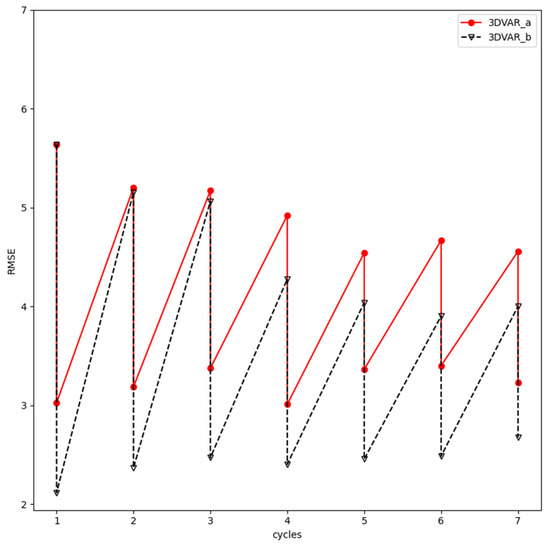 In order to assess the effectiveness of different data assimilation setups, the RMSE (root mean square error) corresponding to radial wind velocity was computed by comparing the analysis fields with radar measurements at each assimilation interval. Figure 7 illustrates the RMSE evolution across seven assimilation cycles for the 3DVAR_a and 3DVAR_b experiments. These two experiments differ solely in their background error horizontal length scale settings.