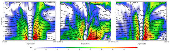 To build upon the horizontal diagnostics, this study further analyzes the vertical characteristics of Typhoon Doksuri. As shown in Figure 9, the plotted cross-sections reveal the distribution of tangential wind and potential temperature (PT) across the storm’s central axis. The eyewall boundary is unclear, and the thermal gradient is not well developed. Additionally, 3DVAR_a (Figure 9b) shows enhanced wind speeds, with peak values above 50 , but these winds extend unrealistically into the mid-to-upper levels, suggesting vertical over-propagation of assimilated signals. In contrast, 3DVAR_b (Figure 9c) concentrates high winds within 1–3 and exhibits a more upright, vertically coherent vortex. The PT contours show a well-defined warm core near the center, with symmetric isentropic patterns and sharper gradients near the eye wall. These features indicate a more physically consistent thermodynamic structure in the 3DVAR_b simulation.