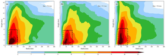 To further assess the realism and theoretical consistency of the simulated typhoon structures, the azimuthally averaged tangential wind profiles were compared with conceptual models and observational composites. According to the axisymmetric theory proposed by Emanuel (1986) [46], a mature tropical cyclone should exhibit an angular momentum-conserving structure with a compact eyewall, vertically aligned tangential wind maximum, and an outward-sloping radius of maximum wind (RMW). Similarly, Stern and Nolan (2009) [47] analyzed Doppler wind retrievals from 17 real storms and confirmed that RMW generally slopes outward with height and closely follows absolute angular momentum surfaces.