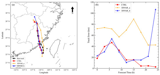Simulated tracks of Typhoon Doksuri covering the period from 0600 UTC on 27 July to 0600 UTC on 28 July 2023. (a) Track trajectories from the three simulation groups (CTRL, 3DVAR_a, and 3DVAR_b) overlaid with the reference path provided by the CMA best track dataset. (b) Evolution of track errors (in kilometers) throughout the 24-h forecast period, assessed relative to the reference trajectory in each case.