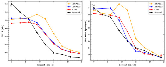 Evolution of Typhoon Doksuri’s intensity over a 24-h period, starting from 0600 UTC on 27 July 2023. (a) Change in central pressure (MSLP, in hPa); (b) Peak surface wind speed (MSW, in m/s). The solid lines indicate CMA’s corresponding best-track values.