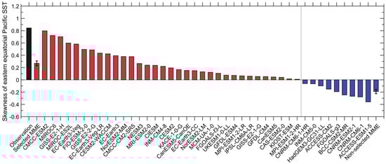Recent studies suggest that ENSO exhibits inherent nonlinearity [49,50,51,52]. Skewness serves as one indicator of system nonlinearity [53,54]. For model selection, a key criterion is the presence of positive asymmetry in SST anomalies over the eastern equatorial Pacific, as positive SST skewness in this region is primarily governed by the nonlinear Bjerknes feedback. However, many models tend to underestimate this feature. A model that cannot adequately reproduce these fundamental features is unlikely—let alone able—to represent the relationship between El Niño magnitude and WPWP displacement. Among the 42 models analyzed, 33 demonstrate a positive skewness in the eastern equatorial Pacific SST anomaly over the period from 1929 to 2014 (Figure 1), with MME mean of 0.27. A more precise representation of ENSO skewness is associated with an improved characterization of ENSO dynamics [20,22,23]. Therefore, the 33 models exhibiting positive skewness have been selected for further analysis.