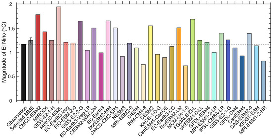 Magnitude of El Niño based on SST anomalies in the eastern equatorial Pacific (5° S–5 °N, 155° W–70° W). The black bar and dashed line denote the observed value, while colored bars represent simulation results from individual CMIP6 models. The MME mean is shown as a gray bar. The error bar, represented by a black symbol above the gray bar, reflects the standard deviation of El Niño magnitude across all models.