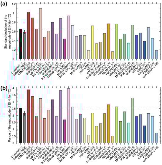 The CMIP6 models generally exhibit an underestimation of the diversity in the magnitude of El Niño events (Figure 4). When assessed using the standard deviation of El Niño magnitude, 21 out of 33 models demonstrate a lower diversity than what is observed (Figure 4a). Notably, the GISS-E2-1-H model is the only model that reproduces a diversity level comparable to the observed data, and it is also recognized as one of the most effective models in simulating the amplitude of the ENSO [23]. The MME standard deviation is calculated to be 0.59 °C, which is slightly lower than the observed value of 0.65 °C. When diversity is quantified by the range of El Niño magnitudes, the underestimation becomes even more pronounced (Figure 4b). In this context, 23 out of 33 models simulate a diversity that is weaker than that observed. The models FIO-ESM-2-0, CMCC-CM2-SR5, and FGOALS-f3-L demonstrate the closest alignment with observed values. Furthermore, the MME mean range is also lower than the observed range (2.17 °C compared to 2.54 °C). Despite the differences in these two metrics of diversity, the results remain consistent—models that exhibit weaker diversity based on standard deviation also tend to show reduced diversity when measured by range, which is defined as the difference between the maximum and minimum values of magnitude.