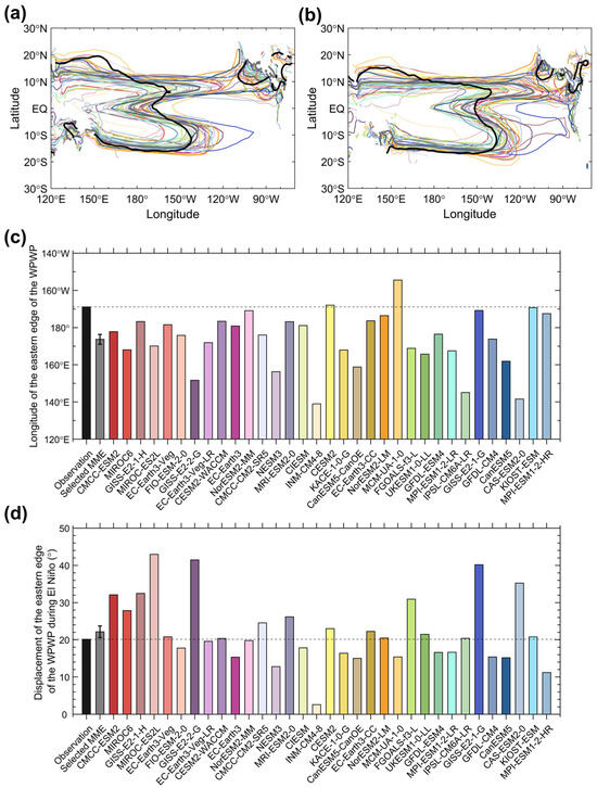 The 28 °C isotherm in time-mean state and during El Niño events in observations and CMIP6 models: (a,b) the 28 °C isotherms for time-mean state and composite El Niño events; (c,d) climatological mean position of 28 °C isotherm and its eastward displacement during El Niño events. Contours and bars of the same color correspond to the same model.