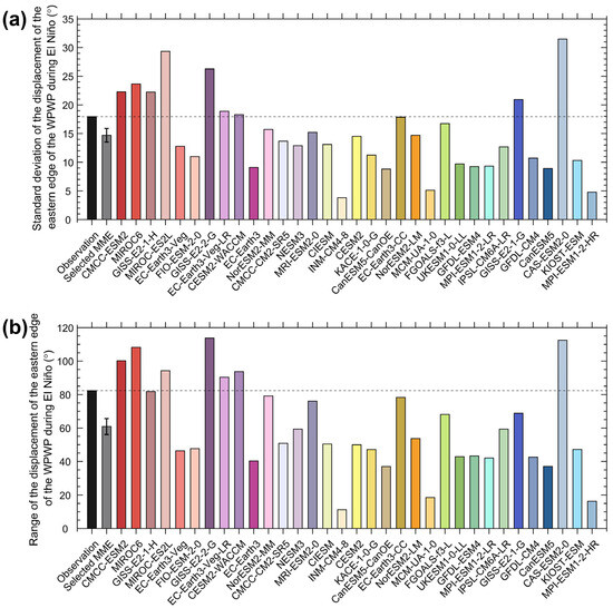 Diversity in WPWP’s eastern edge displacement during El Niño events. The black bar and dashed line indicate the observed value, while the gray bar represents the MME mean. The error bar above the gray bar, shown as a black symbol, denotes the standard deviation among models. Colored bars reflect results from individual models. Diversity is quantified using two metrics: (a) standard deviation and (b) range (i.e., the difference between the easternmost and westernmost positions of the WPWP boundary).