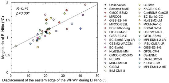 Scatter plot of WPWP’s eastern edge displacement versus El Niño magnitude in observations and CMIP6 models. The gray line indicates the least squares regression fit. The correlation coefficient (R) quantifies the strength of the linear relationship.