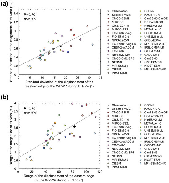 As expected, a significant relationship exists between the diversity of El Niño magnitude and the variability in the displacement of the eastern edge of the WPWP (Figure 9). When diversity is assessed using the standard deviation, the correlation coefficient between the variability of El Niño magnitude and the displacement of the eastern edge of the WPWP is 0.76, with a significance level of 99.9% (Figure 9a). Similarly, when diversity is quantified by the range between the maximum and minimum values, the correlation coefficient of 0.75 is comparable to that derived from the standard deviation and also demonstrates significance at the 99.9% confidence level (Figure 9b). The majority of CMIP6 models show limited diversity in the displacement of the WPWP’s eastern edge, which correlates with a reduced diversity in El Niño magnitude. This consistency further reinforces the robustness of the identified relationship, underscoring the effect of WPWP dynamics on the intensity of El Niño events.