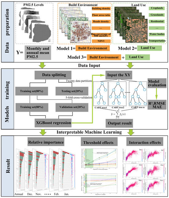 This study investigates the impacts of the built environment and land use on both monthly and annual mean PM2.5 levels employing the XGBoost. It explores the threshold effect and interaction of influencing factors and proposes measures and suggestions for PM2.5 mitigation. The analytical framework utilized in this study is illustrated in Figure 2.