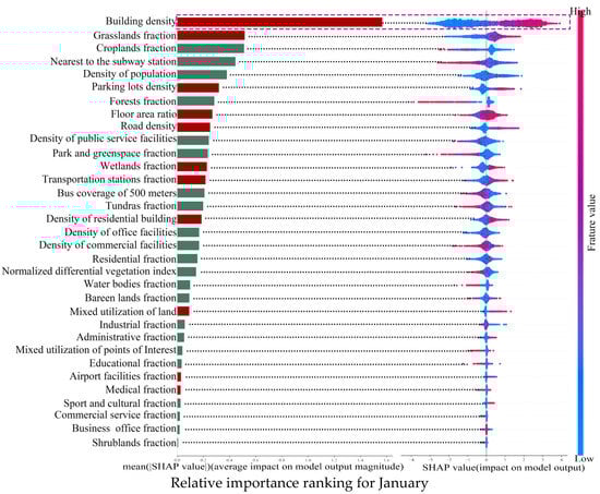 In the formula, m represents a feature, H denotes the set of all features, G represents the set of all features excluding m, denotes the factorial of the number of features in G, represents the input feature values in G, denotes a model trained with the feature in i, fs denotes another model trained without the feature , represents the difference in outputs between the two models. If the result of is greater than 0, it is considered that the feature has a positive impact on the model prediction; otherwise, it proves that the feature has a negative effect on the model prediction. In this study, we use SHAP analysis to rank the global importance of explanatory variables. Then, we use SHAP value interactions to identify sensitive factors influencing the built environment and land use on PM2.5.