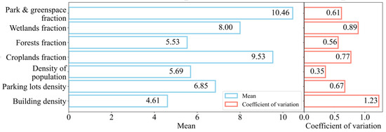To investigate the differences in the relative importance of variables on a monthly and annual mean basis, we ranked the 33 variables in Model 3 according to their explanatory power. Figure 5 shows the monthly and annual mean relative importance ranking of the 33 variables in Model 3, sorted according to their explanatory power for PM2.5 levels, with the variable importance ranked from strong to weak, corresponding to a descending order. Overall, the highlighted lines in the figure gradually converge from left to right, suggesting that these variables tend to stabilize in their annual mean explanation over time. Still, the significant differences between months must be addressed. Secondly, we calculated the mean and coefficient of variation in the ranking of explanatory power for the seven variables (Figure 6). Among them, building density, forests fraction, density of population, and parking lots density have relatively low mean rankings, indicating a significant impact on PM2.5 levels. The coefficients of variation for density of population, forests fraction, park and greenspace fraction, and forests fraction are relatively small, suggesting that these variables provide a stable mitigation effect on PM2.5 levels monthly and annually as control indicators. Variables with more significant fluctuations include building density, wetlands fraction, and croplands fraction, which exhibit more significant monthly variations, indicating that metrics focused on specific months might be more effective.