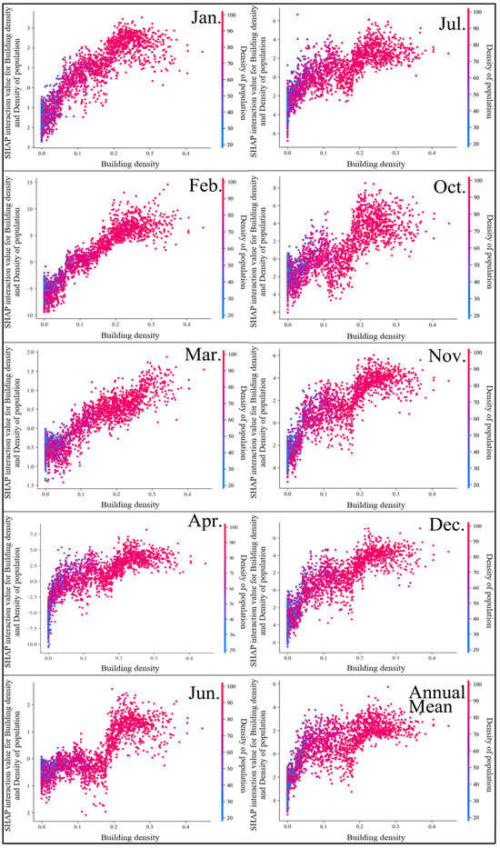 We conducted analyses based on the built environment and land use to better understand the interaction effects of influencing factors on the annual mean and monthly PM2.5 levels. Figure 8 illustrates the interactions between building density and density of population. In analyzing the interaction between building density and population density, the X-axis represents “building density,” ranging from 0 to 0.4, while the Y-axis represents “SHAP interaction values.” As building density steadily increases, an accompanying rise in population density will lead to a continuous increase in SHAP values, resulting in a positive interaction effect that further raises the predicted levels of PM2.5. Additionally, there may be subtle differences in distribution and density models across different months. For instance, in June, when building density is between 0.1 and 0.2, there might be fluctuations. However, these fluctuations do not affect the overall positive interaction effect. Figures S2–S6 (see Supplemental Material), respectively, illustrate the interactions between building density and parking lots density, wetlands fraction, croplands fraction, park and greenspace fraction, and forests fraction. These interactions positively impact PM2.5 levels predictions, while the interactions during March, August, and September are not significant. As building density increases, simultaneous increases in the density of population, parking lots density, and wetlands fraction lead to higher predicted PM2.5 levels (Figure 8, Figures S2 and S3). The increase in building density, coupled with a decrease in croplands fraction, park and greenspace fraction, and forests fraction, results in higher PM2.5 levels predictions. These results point to building density and are attributed to the built environment. This confirms that building density significantly impacts PM2.5 levels in Beijing. This finding is consistent with previous studies conducted in Beijing and other cities [7,63,64]. Adjusting building density is not feasible in the short term for the highly polluted months of October, November, and December. Based on the interactions, potential mitigation measures include increasing park and greenspace fraction, croplands fraction, and forests fraction. These indicators are all related to land use [65,66].