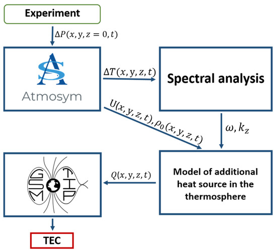 To numerically determine the temporal variations in TEC, we employed a comprehensive approach [23] that accounts for the propagation of AWs and IGWs generated by a tropospheric meteorological source. Figure 1 presents a schematic representation of the main stages of this approach. In Figure 1, is experimentally obtained pressure variations, which are used in the calculations as the lower boundary condition.