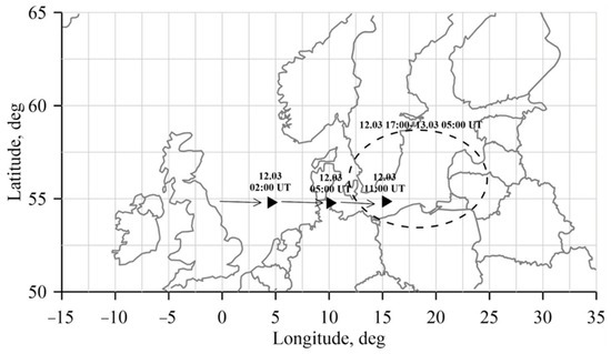Schematic representation of Storm Laura’s movement on 12 March 2020. The dashed line indicates the characteristic region of meteorological disturbances over the Baltic Sea during Storm Laura.