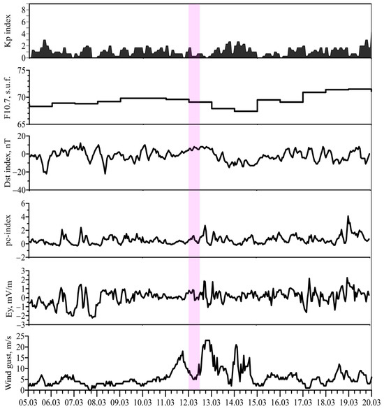 Geomagnetic activity indices (Kp, Dst), F10.7 solar flux, and wind gust speed in Kaliningrad (54°53′ N, 20°35′ E) from 5 March to 20 March 2020. The area highlighted in pink indicates the time period under study.