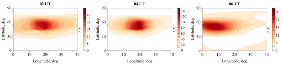 Figure 4 presents the latitude–longitude distribution of temperature disturbances at 02:00, 04:00, and 06:00 UT on 12 March 2020, at an altitude of 294 km. Note that one of the reasons for choosing the altitude of 294 km is that it is a node of the calculation grid of the GSM TIP model. Moreover, no significant difference was observed compared to the nearest nodes. As seen in Figure 4, at 02:00 UT, a temperature increase (ΔT) forms over the meteorological storm region, reaching a maximum of ΔT = 40 K. By 04:00 UT, the area of elevated temperature is localized between 45 and 60° N and 10–25° E, with a peak disturbance exceeding ΔT = 100 K. Later, at 06:00 UT, the amplitude of disturbances decreases, and the perturbation region shifts westward.