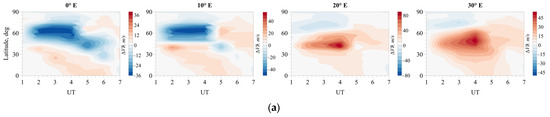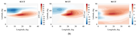 The wind variations exhibit a rather complex pattern. When analyzing the latitude–longitude structure of the wind at different time instants (see Figure 5b), a structured pattern forms over the perturbation region in the lower atmosphere at 02:00 UT and 04:00 UT. A detailed mechanism for the formation of this structure is described in [23]. By 06:00 UT, the wind structure appears to change, and only a positive effect is observed.