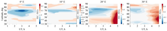Analysis of latitude–time model TEC variations at different longitudes (see Figure 6) reveals that, one hour after the activation of the heat source, a negative effect formed at latitudes 55–75° N across all considered longitudes. The maximum negative effect is observed at 20° E, localized north of the perturbation region, reaching 0.8 TECu. The maximum positive effect appears south of the perturbation region four hours after the heat source activation. At 10° E and 30° E, the regions with negative effects are smaller, and the values do not exceed 0.3 TECu. The calculated TEC values varied in interval 5–7 TECu during a reference time.