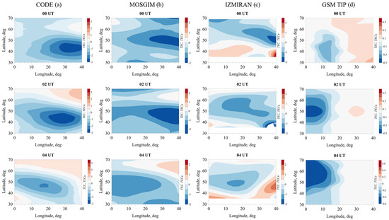 TEC differences between the meteorologically disturbed day (12 March 2020) and the meteorologically quiet day (10 March 2020), based on the following: (a) GIM TEC CODE; (b) GIM TEC MOSGIM; (c) regional European TEC maps from IZMIRAN; (d) GSM TIP model. Data are shown for 02:00 UT, 04:00 UT, and 06:00 UT.