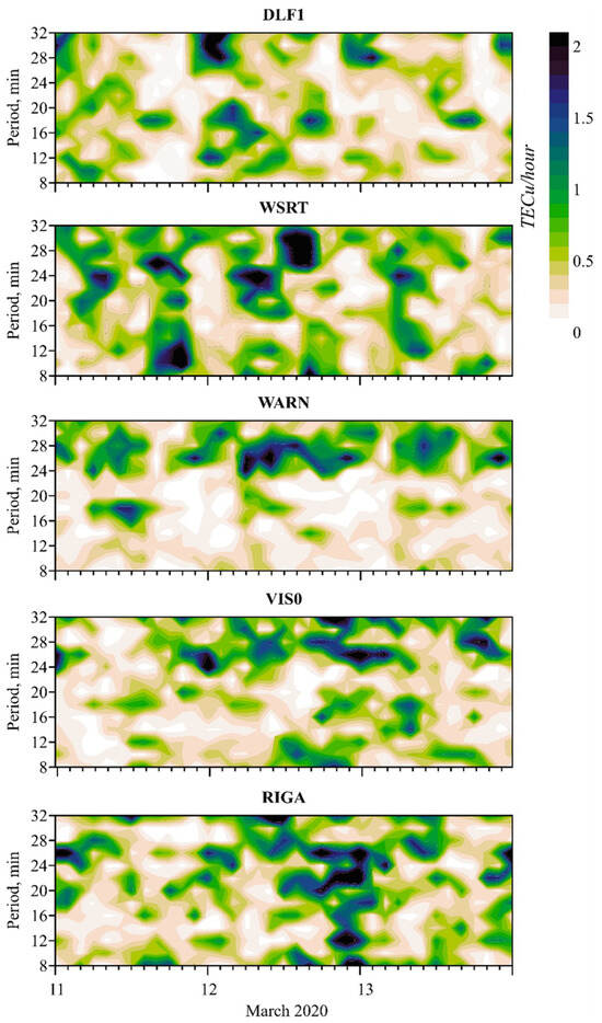 TEC variations for each station were obtained using the System for Ionosphere Monitoring and Research from GNSS (SIMuRG) [38,39,40]. A spectral analysis of the TEC variation time series was performed to identify characteristic wave periods during the meteorological storm. The analysis was conducted using the Lomb–Scargle method [41] with a sliding window approach for data selection. This method enables the calculation of spectrograms within a specified frequency range for both regular and irregular time series [42,43]. In this study, the focus is on periods of 8–32 min, which include the primary harmonics of atmospheric gravity waves propagating from the meteorological storm region. The results of the spectral analysis for 11–13 March 2020 are presented in Figure 8.