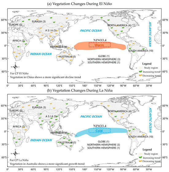Comparison of vegetation trends under (a) El Niño and (b) La Niña conditions, based on anomalies in the normalized difference vegetation index (NDVI) for most global regions, leaf area index (LAI) anomalies specifically for Australia, and fraction of photosynthetically active radiation (FPAR) anomalies for North America. Gray-shaded areas indicate the study regions analyzed in the reviewed articles, with numbers in parentheses representing the corresponding publication counts. Green grass denotes favorable conditions for vegetation growth, while yellow grass signifies unfavorable conditions.