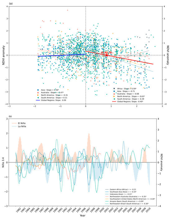 This section investigates the impacts of El Niño and La Niña on global vegetation trends. Figure 2 illustrates the relationship between vegetation NDVI anomalies and the Niño 3.4 index, which represents ENSO intensity, based on existing studies. To ensure data reliability, only data from the 1982–2010 period were included. An examination of the scatter plots along the X-axis revealed that El Niño events as a group tend to be stronger than La Niña events, which was consistent with previous research [49]. The fitted line represents the NDVI anomaly in response to varying intensities of ENSO across different regions. The red fitted line indicates a negative correlation between global vegetation and El Niño events. Moreover, when the Niño 3.4 index exceeded approximately 0.82, stronger El Niño events led to more severe declines in vegetation growth. In contrast, the influence of La Niña on global vegetation was relatively weak and did not reach statistical significance. Additionally, there were notable changes in the NDVI anomaly and the Niño 3.4 index over the time series.