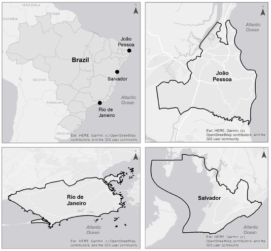 Location of the cities of João Pessoa, Salvador, and Rio de Janeiro, Brazil. The (top-left) panel shows the general location of the three cities within the Brazilian territory. The adjacent panels provide detailed views of the municipal boundaries of João Pessoa (PB), Salvador (BA), and Rio de Janeiro (RJ), respectively, highlighting their positions along the Atlantic coast. Geographic data were sourced from IBGE, OpenStreetMap, and Esri.
