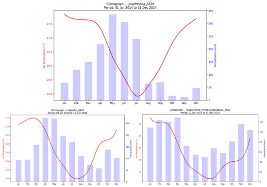 This section presents the results of the climatological and bioclimatic analysis for the three cities. The findings are organized in the following sequence: (i) general climatic profiles based on temperature and precipitation data; (ii) analysis of thermal comfort using PET indices; and (iii) assessment of tourism suitability through CTIS indicators. The climate diagrams (climographs) for João Pessoa, Salvador, and Rio de Janeiro, (Figure 2) for the period from 1 January 2014, to 31 December 2024, illustrate distinct seasonal patterns of temperature and precipitation across the cities.