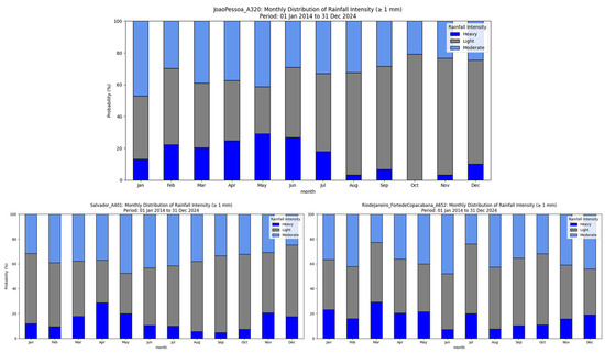 Monthly distribution of rainfall intensity (≥1 mm) for the period from 1 January 2014 to 31 December 2024. The stacked bar charts represent the relative frequency of light, moderate, and heavy rainfall events in the cities of João Pessoa (top), Salvador (bottom left), and Rio de Janeiro (bottom right). Each bar corresponds to the percentage distribution of rainfall intensity for each month, highlighting seasonal variations and differences between the three coastal cities.