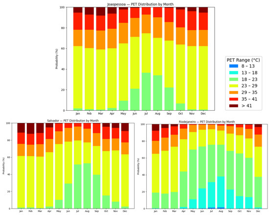 Monthly distribution of Physiological Equivalent Temperature (PET) categories in João Pessoa (top), Salvador (bottom left), and Rio de Janeiro (bottom right). The stacked bar charts show the relative frequency of PET values categorized into thermal perception ranges, for each month, based on data from 1 January 2014 to 31 December 2024. The PET intervals follow standard classifications of human thermal comfort and stress, ranging from cold conditions (≤4 °C) to extreme heat stress (>41 °C), allowing seasonal comparison of thermal sensation among the three coastal cities.