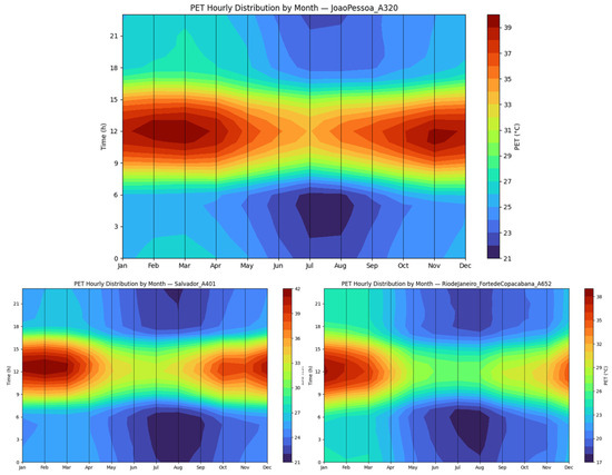 Hourly distribution of Physiological Equivalent Temperature (PET) by month for João Pessoa (top), Salvador (bottom left), and Rio de Janeiro (bottom right). These contour plots illustrate the diurnal and seasonal variation in thermal comfort conditions from January 2014 to December 2024. Warmer colors represent higher PET values, indicating greater thermal stress, typically occurring between 10:00 and 15:00, especially during the warmer months. Cooler tones represent more comfortable or mild conditions. This temporal analysis highlights the intensity and duration of heat stress across different times of the day and seasons in each city.