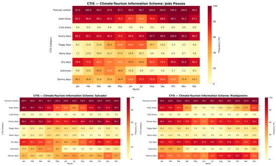 When compared to Salvador and Rio de Janeiro, João Pessoa demonstrates lower thermal variability, both between months and across daily cycles. While Rio de Janeiro frequently records PET values above 35 °C between December and March, often extending throughout the afternoon, João Pessoa rarely exceeds this threshold. Salvador, although slightly less extreme than Rio, still presents higher PET peaks and longer durations of thermal stress between March and May. To better understand the other factors related to climate suitability, Figure 6 shows the CTIS graphs for the three cities, integrating multiple variables, such as thermal comfort, heat and cold stress, sunshine duration, rainfall, humidity, and storm frequency.