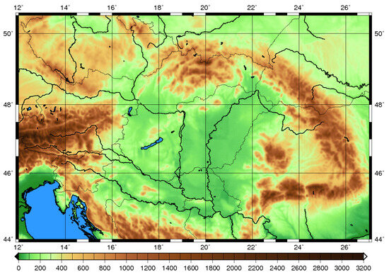 The AROME cy43t2 non-hydrostatic forecast model was run at HungaroMet eight times a day (at 0, 3, 6, 9, 12, 15, 18, and 21 UTC), 48 h ahead. The domain covers the Carpathian Region with a horizontal resolution of 2.5 km and a vertical resolution of 60 level (Figure 1). In the upper air, 3D-Var is used with a 3-hourly cycle and a 3-hourly assimilation window [10,11]. We assimilate measurements from synoptic stations (2-m temperature and relative humidity, 10-m wind, and station level pressure), radiosondes (temperature, humidity, wind, and geopotential height), AMDAR and Mode-S MRAR aircraft observations (wind, temperature, and humidity), and GNSS-ZTD data. The soil model of the AROME is the SURFEX 8.0 model [22], which can be used directly coupled (online) to the atmospheric model as well as independently in offline mode. SURFEX describes the transport of heat and moisture between the atmosphere and the soil, and between different layers of the soil.
