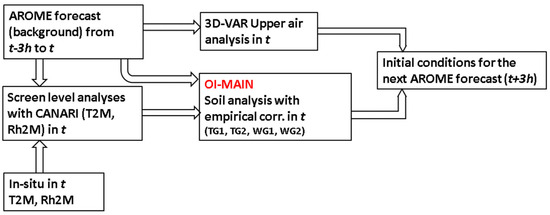 - Background state preparation: The AROME model forecast is run from t − 3h to t to provide the background land surface state.