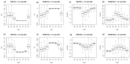 Boxplots of averaged Jacobians over the domain for (a) , (b) , (c) , (d) , (f) , (g) , (h) for July 2021. The top row of the figure refers to Jacobians in the superficial soil layer, while the bottom row refers to Jacobians in the root zone.