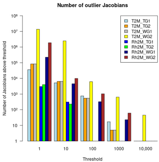Furthermore, regardless of the selected threshold, the number of outliers was orders of magnitude higher for than for any other Jacobians. This indicates that the SURFEX shows a high sensitivity of T2M to the root-zone soil moisture (WG2), and large corrections in soil moisture during the analysis can cause large discrepancies in T2M.