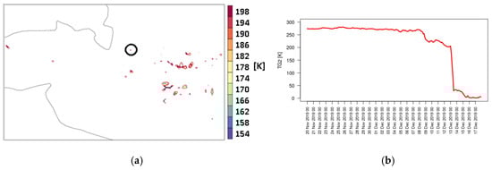 (a) TG2 analysis at 12 UTC on 15 December 2019. Only the extremely cold areas are drawn. (b) Temporal evolution of TG2 at the marked point from 20 November 2019 00 UTC to 17 December 2019 21 UTC.