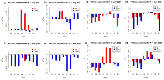 Analysis increments for soil moisture ((a,e) WG1, (b,f) WG2) and soil temperature ((c,g) TG1, (d,h) TG2) in different analysis times averaged for the whole period and for all grid points over the domain. The top row of the figure refers to the summer period (July 2021), while the bottom row refers to the winter period (January 2022).
